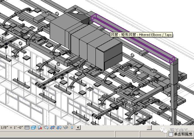 在视图窗口中,将光标悬停在风管的剖面图上。边会高亮显示,然后工具提示和状态栏会显示关于风管的信息。