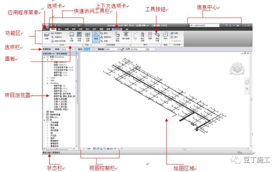 下图显示了Project Browser(项目浏览器)、状态栏、View Control Bar(视图控制栏)和Revit MEP用户界面的其他图元。