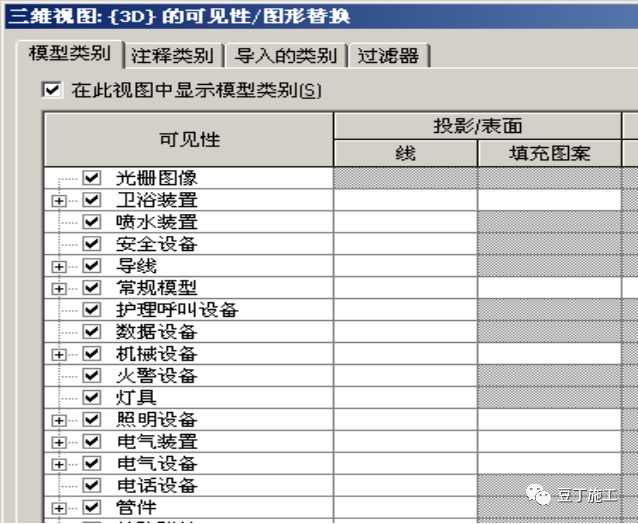 在可见性/图形替换对话框中,注意此视图的可见性设置。