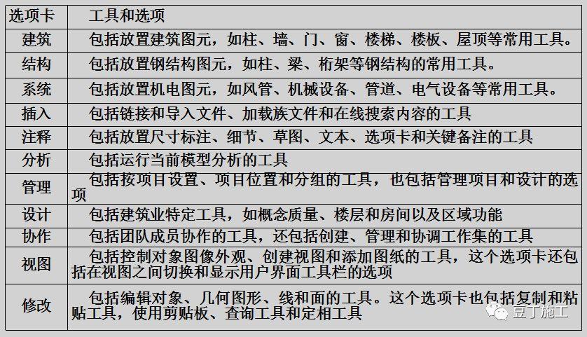 下表列出了可以在Autodesk Revit的11个功能区选项卡上访问的工具和选项。