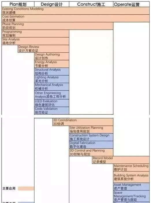 建筑业的工序在国内外实质上大同小异,BIM的应用也是如此,但有些应用二者的划分尺度不一样,如前者的“3D协调”与后者的“管线综合”类似,但后者的描述过于狭窄,好像仅限于管线的碰撞分析,而结构梁柱引起的净空高度不够等其他构建协调优化问题就不管了,所以前者的描述较为全面。
