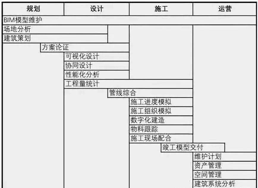 以下就项目前期策划阶段、设计阶段、施工阶段和运营阶段中BIM的应用进行一个概括性介绍: