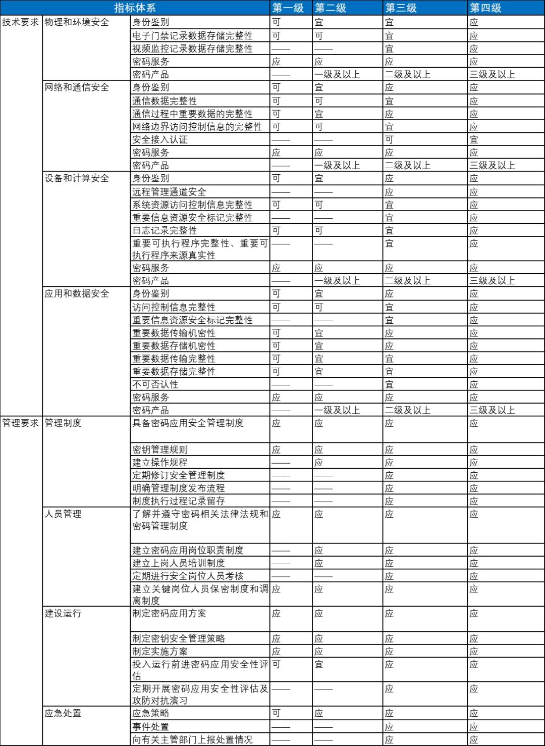 不同级别密码应用基本要求汇总表