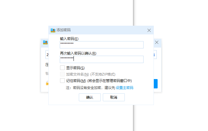 5、在第一个框框输入一个密码,在第二个框框再输入一次密码,两次密码要一样哦。然后鼠标左键点击确定。返回上个界面后鼠标左键点击立即压缩。建议密码要8位以上包含数字和和英文字母,不要使用12345678这种简单的,被其他人猜到就不好了。如果你的密码包含大小写英文字符和数字还有特殊字符,8位以上,这世界除了你自己,估计没有第二个人能打开这个文件了!