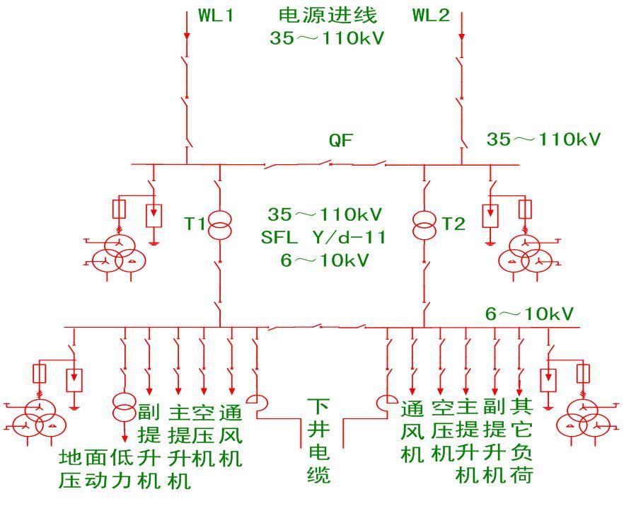 目前,矿井井下的供电系统主要是由两种类型 的供电系统组成:一种是以交流电为主供电的供电系统,另一种是以直流电为主供电的供电系统。