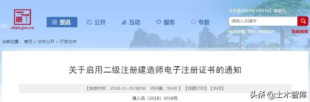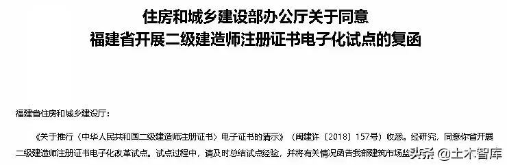2019年3月5日,住建部官网公布复函,同意福建省开展二级建造师注册证书电子化试点。这是住建部同意的第8个二建注册证书电子化试点地区。