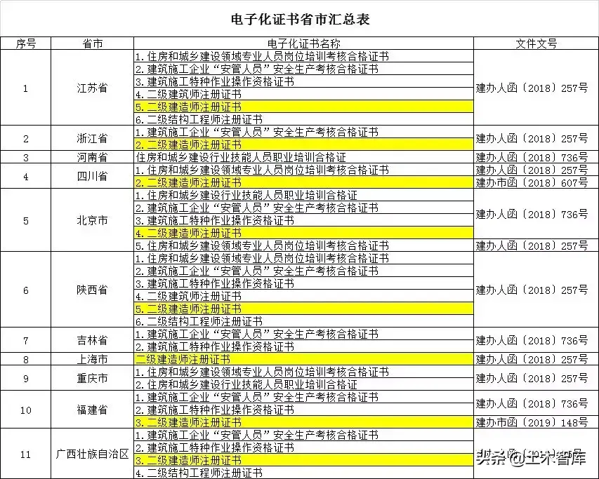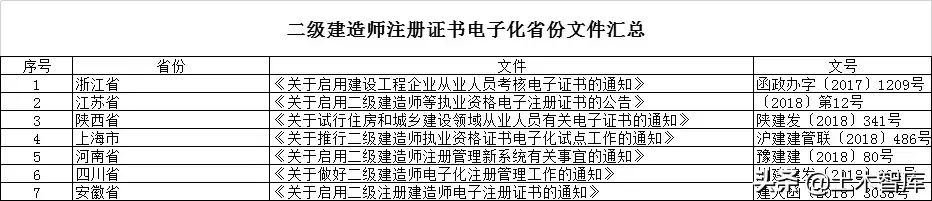 各试点地区做好信息互通共享,对同一试点证书采用统一的电子化证书格式;做好与现有政策的衔接,加强对取得电子化证书人员身份实名信息认证;及时做好相关数据的对接、上传,实现证书网上查询和省域互通互认。截至3月,已有多个省市下发文件,明确进行二建注册证书电子化,分别为浙江、江苏、陕西、上海、河南、四川、安徽(安徽为非试点省份)。