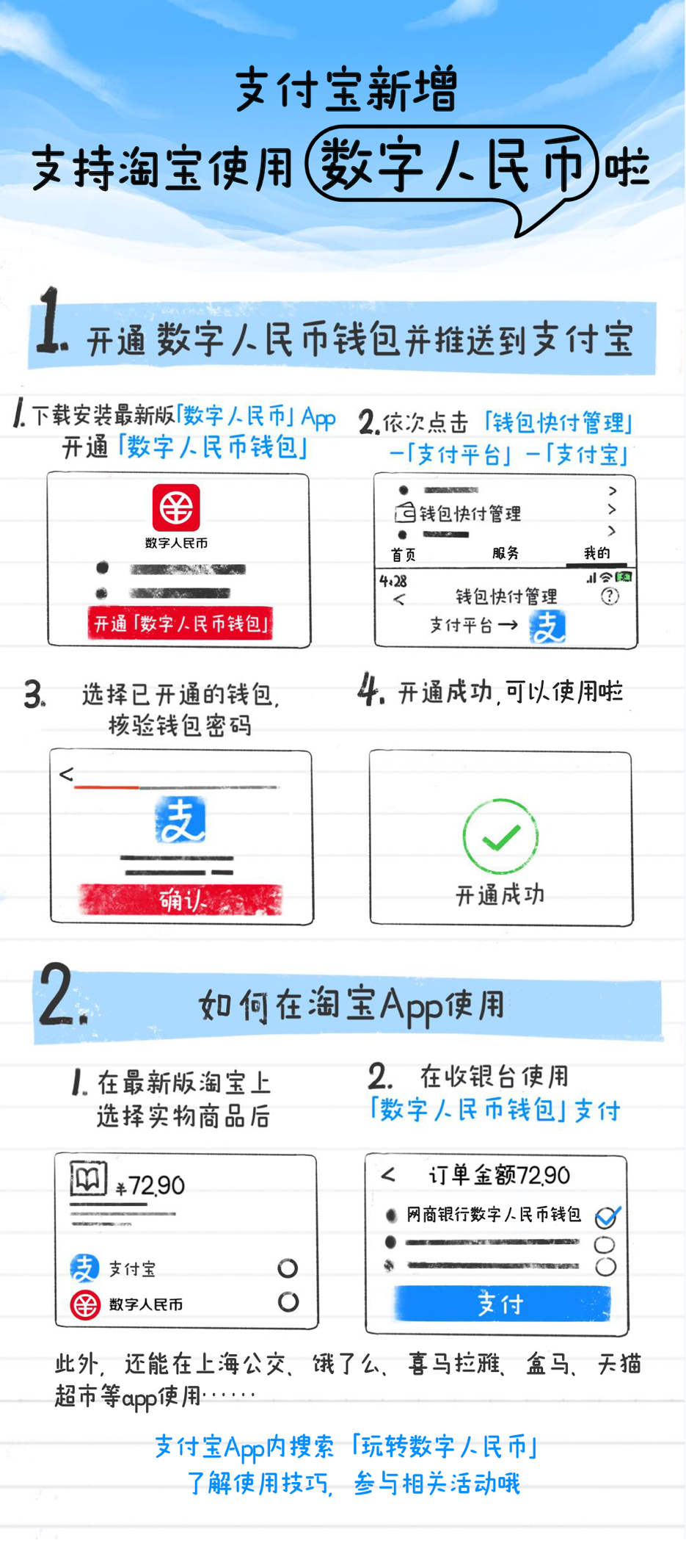 同日,支付宝面向淘宝用户逐步开放数字人民币支付功能,用户可开通数字人民币钱包并推送到支付宝。在最新版淘宝App上,用户选择实物商品后,收银方式可选择“数字人民币钱包”进行支付。