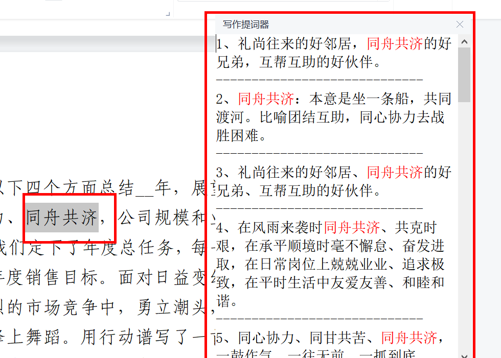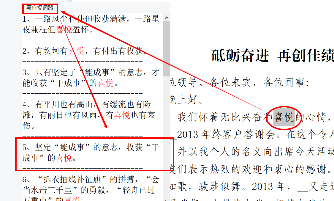 原文中“喜悦的心情”通过自动写作提词,发现“坚定能成事的意志,收获干成事的喜悦”还不错,所有修改一下。一是避免了抄袭,二是突出了文采。