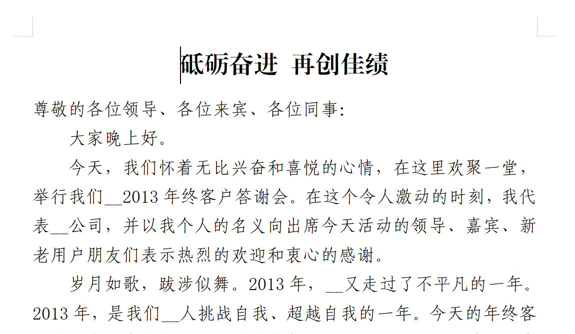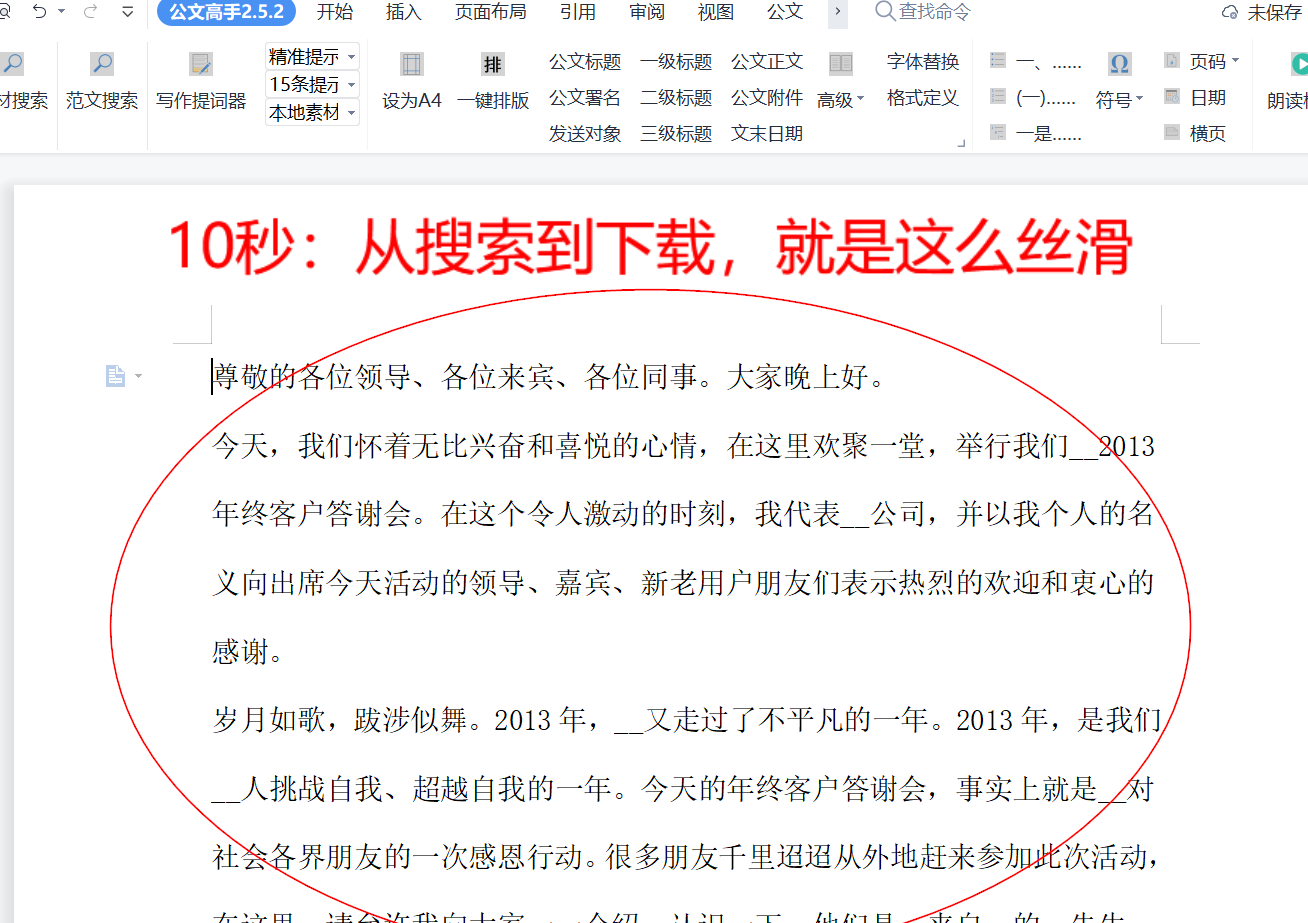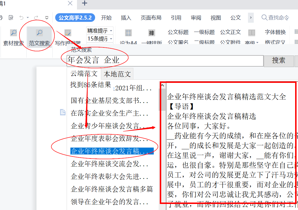 然后快速下载一篇范文,模拟的是“某企业举办年会,某某员工需要做一篇发言”,所以在工具栏范文搜索中搜索“年会发言+企业”,通过预览选择一篇作为主模板。