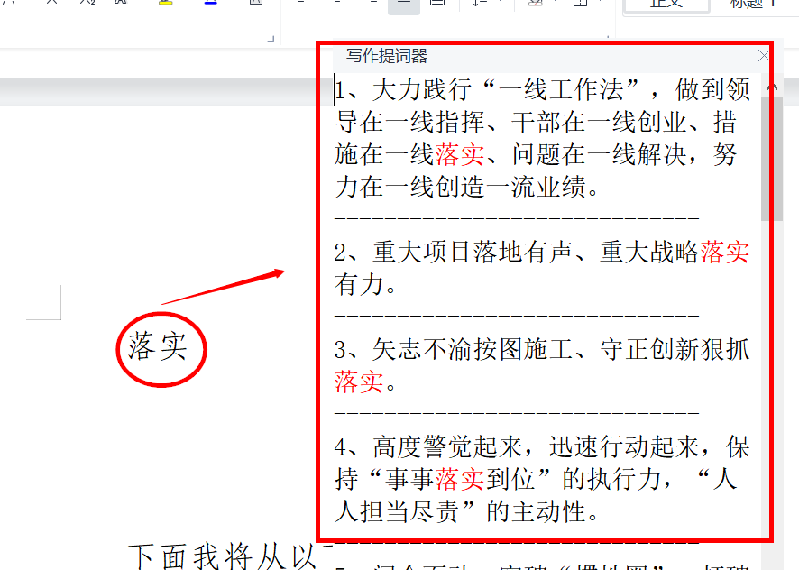 又比如,“落实”不知道如何搭配,很简单,智能辅助写作。