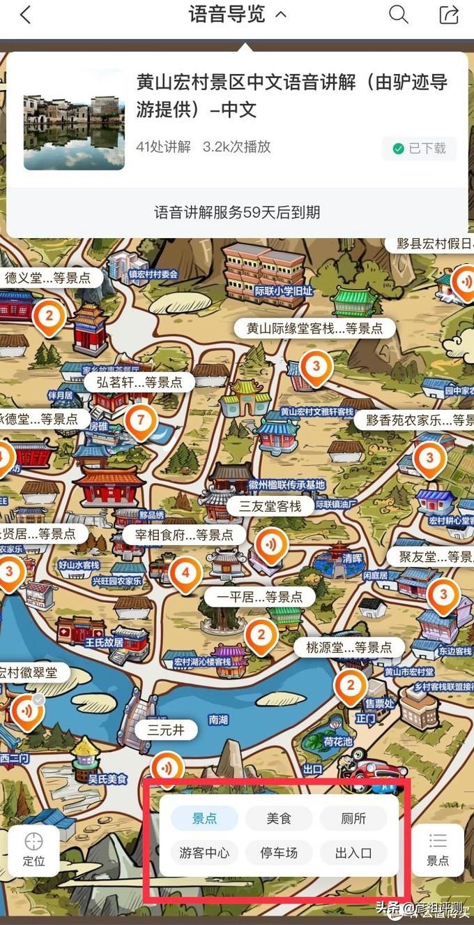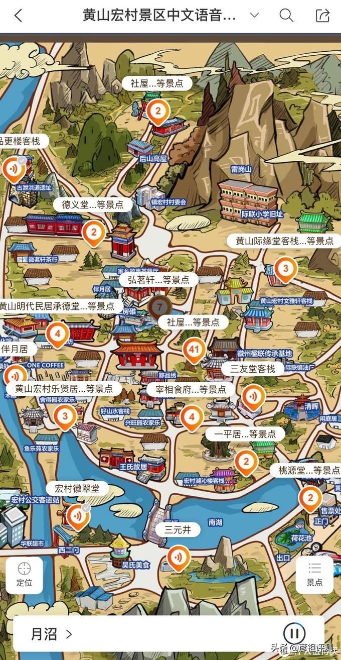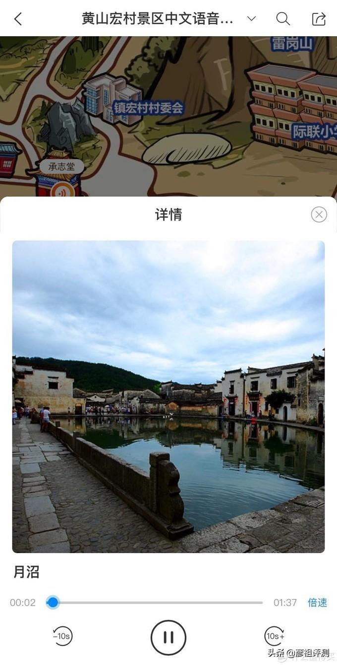 点开景点的讲解,有景点的简图和讲解语音,当然你可以调节语速。下面这个图片是购买的第二个景点宏村的地图,以及其中的一个景点的讲解简图。