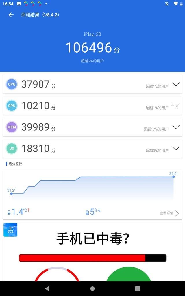 从上图我们可以看到,安兔兔跑分成绩为106496,其中CPU跑分37987分,GPU跑分10210分,在同价位的安卓平板中表现还是不错的,能够满足日常运用,不论是聊天看视频还是玩一部分游戏都是毫无压力的。