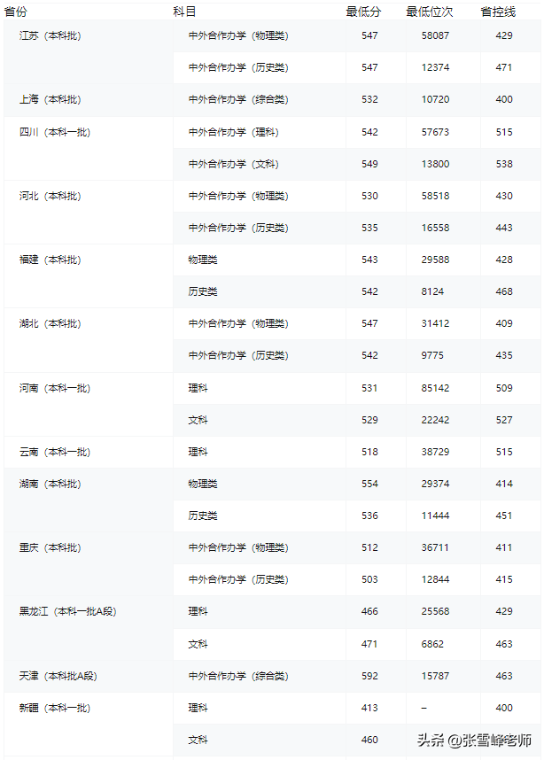 西交利物浦大学的毕业生在世界各地继续深造或工作。2020届毕业生中,超过86%选择继续留学深造,其中38.10%进入世界排名前十的学府,80.36%进入世界排名前100的名校,更有7名学生获得牛津大学、曼彻斯特大学、西湖大学等知名大学的直博录取通知书。2020届选择直接就业的本科毕业生中,近28%就职于世界500强、中国500强、四大会计师事务所等国内外知名企业。2022年西交利物浦大学在部分省份录取最低位次如下图所示(信息来自网络):