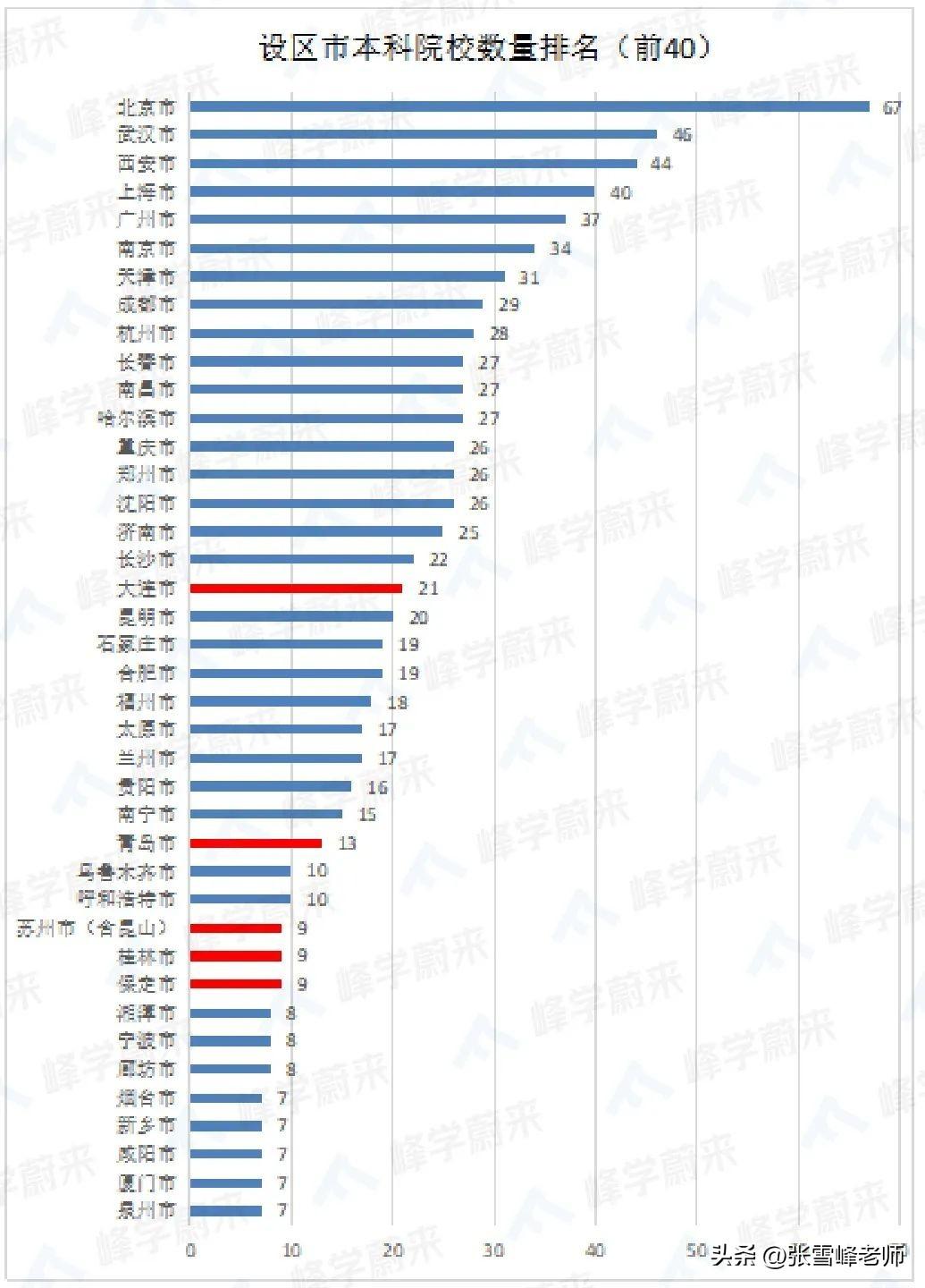根据教育部官网公布的全国普通高等学校名单(截至2022年5月31日),我们整理了所在地高校最多的前40个城市如图所示,除了大家都知道的直辖市和省会城市汇聚了众多高校外,在非直辖市和非省会城市中,大连、青岛、苏州、桂林和保定的本科院校数量名列前茅。其中大连和青岛都是计划单列市,且因为历史原因经济底子好,是各自省份GDP的排头兵。桂林和保定都曾经成为过省会城市,作为曾经的区域政治经济文化中心,高校数量较多也无可厚非。而苏州市作为江苏省经济发展的压舱石,除了GDP总量傲视全省之外,似乎在历史、政治、文化等其方面并没有其他特殊原因可以解释为什么,可见其特殊之处。今天要给大家推荐的大学热门城市就是苏州市(没错,就是我们公司所在地)。