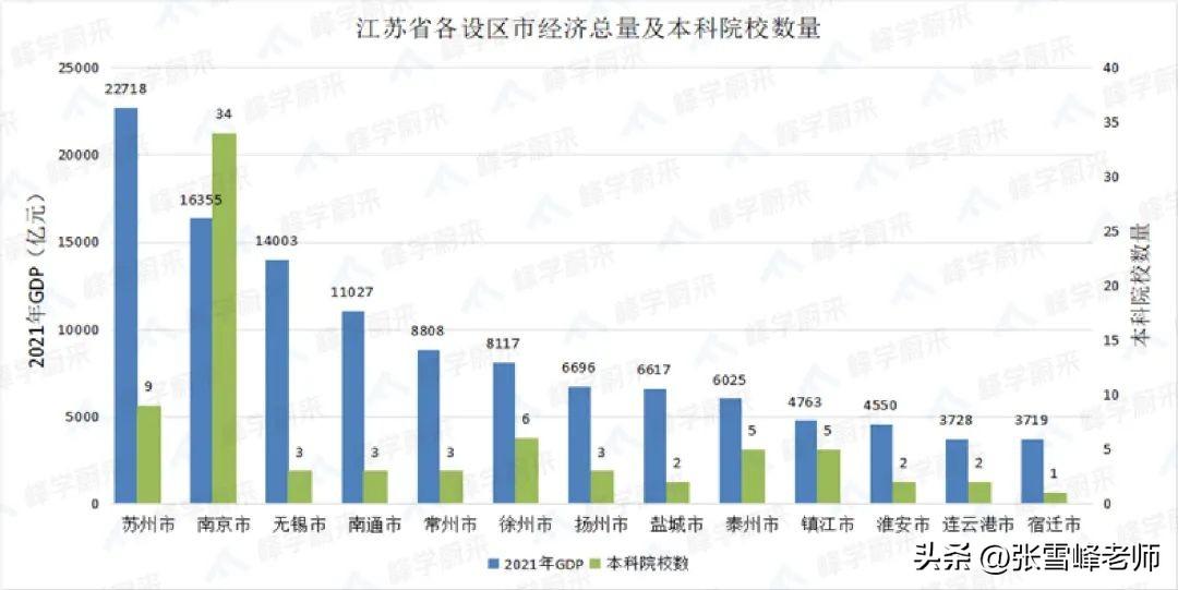 进入21世纪以来,苏州除了大力发展经济建设外,也始终在努力补齐科教短板。近年来,随着苏州的大力投入,苏州高等教育正在经历能级跃升,争取跟上城市发展速度。苏州目前发展高等教育的模式一是全力培养本土高校,而是引进国内外知名院校或开办知名院校的校区和研究院。现在,苏州的高等教育多点开花,西有围绕南京大学(苏州校区)打造的太湖科学城正在如火如荼的建设;东有已经建设20年的独墅湖高教区,汇聚33所中外知名高校和研究院(包括中国人民大学(苏州校区)、东南大学(苏州校区)、中科大苏州高等研究院等等),15家“国家队”科研院所群星闪耀。然而就本科院校总量而言,苏州与高教大市相比仍有不小差距,如下图所示,苏州本科院校数量与城市经济发展的匹配度远远赶不上江苏省会城市南京,这是短板,但对苏州的大学生来说却同样也是机会,对他们来说要留在苏州就业的竞争压力相对就较小。