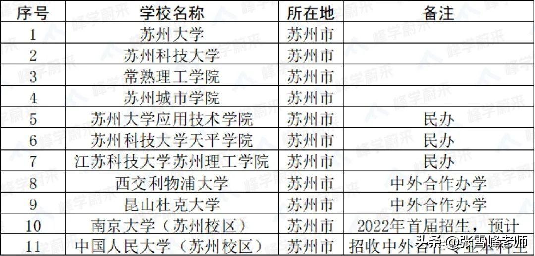 上文有提到位于苏州的本科院校共有9所,如果算上在苏州培养本科生的南京大学(苏州校区)和中国人民大学(苏州校区),则合计有11所本科院校(含校区),具体清单如下: