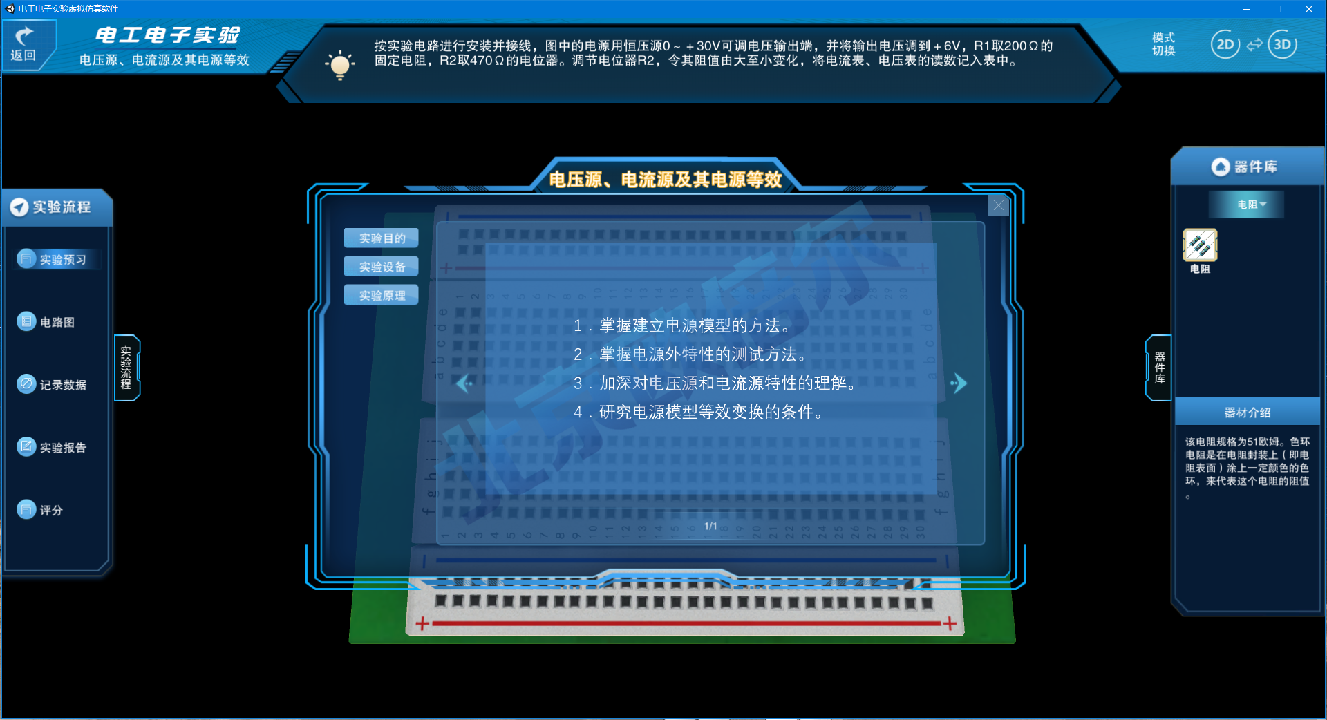 该仿真软件可系统模拟三维电工电子实验操作台、电工电子常规实验方法。系统包括实验数据记录、评分、实验报告、实验预习等功能按钮。软件提供操作步骤指引功能,不同实验调用不同算法模型,提供仿真级别实验数据。软件具有实时记录实验数据的功能,支持导出实验数据到实验报告。