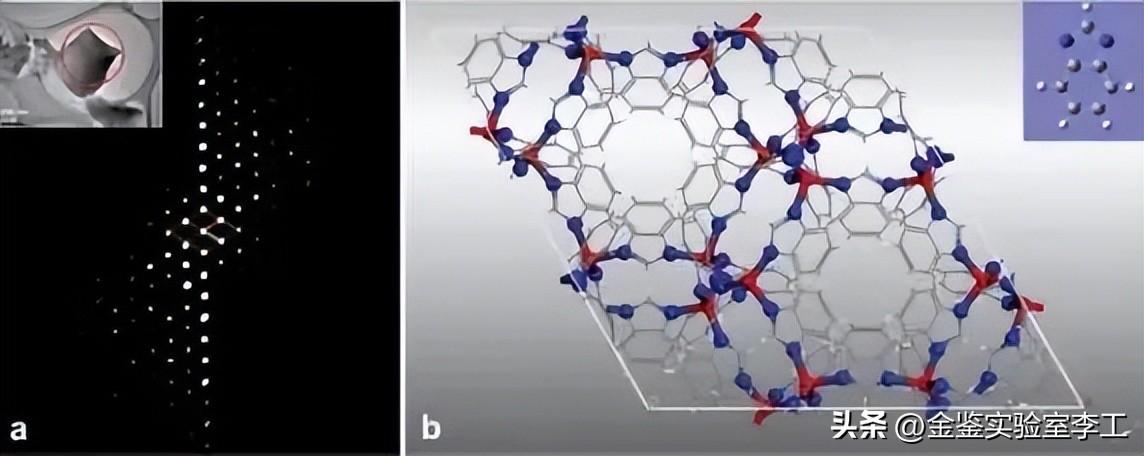 PED 技术通常是沿着晶体的某个晶带轴旋进,要求转正晶体的带轴,而电子衍射的三维重构技术 ADT 和 RED 是使样品进行大角度范围的倾转(通常﹣30º到 +30º ),无需转正晶体的带轴,可沿任意带轴进行数据采集,因此比 PED 技术更有优势。比如由邹晓东教授团队开发的 RED 技术是在控制测角台即样品旋转的同时,控制电子束的偏转,通常样品每转 2º-3º,电子束同时倾转 0.1º-0.4º,这样避免了动力学效应,应用软件在不到一个小时之内可采集上千张电子衍射图,之后再进行谱图融合、单胞确定、指数标定、强度提取等数据处理,之后可应用与 X-射线单晶解析相同的方法进行结构解析及精修,如图 6 为应用 RED 技术解析的一种 MOFs (ZIF-7)的结构。