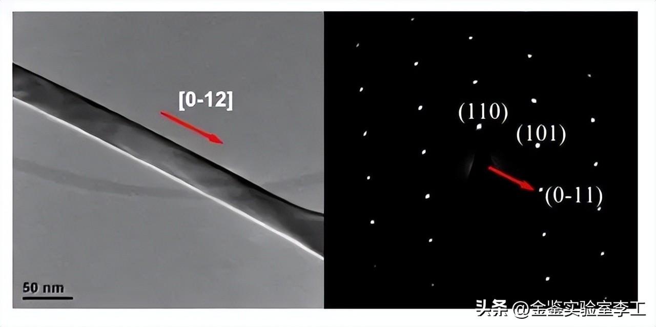 如图 2 所示是判断一维纳米线的生长方向,首先对电子衍射进行标定,纳米线的优势生长面为与纳米线垂直的面,在电子衍射图上找出与此面垂直的透射斑与衍射斑的连线,确定优势生长面是(0-11)面,由于该物质是四方晶系,根据四方晶系的正倒易转换矩阵,将(0-11)面转换为生长方向[0-12]。