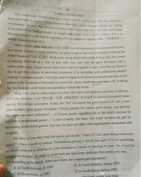电竞现身英语考卷真的吗?阅读理解e-sports the newNBA题目