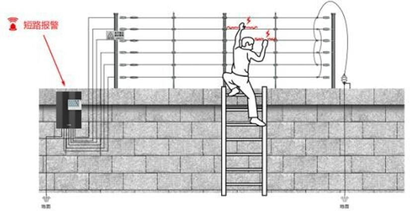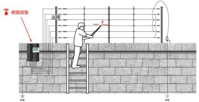 断路报警:当触碰任何一根围栏导线的时候都会受到脉冲电的打击,同时碰触到两根围栏线更会受到电击,防范非常严密。当入侵者试图剪断围栏强行进入则会发生报警。