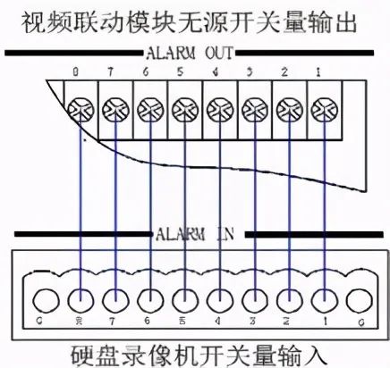 本方案提供两种实现视频联动的方法。第一种方法是通过视频联动模块来实现,把视频联动模块的无源开关 量输出信号与行业硬盘录像机的开关量输入接口连接,如下图所示接线。