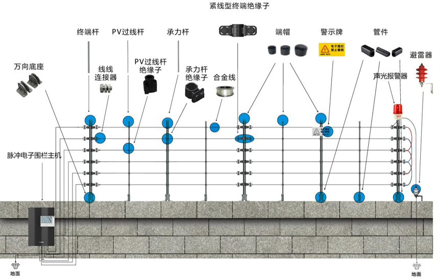 电子围栏由终端杆、承力杆、PV过线杆、PV杆绝缘子、围栏合金导线、警示牌、紧线器等组成。根据现场的周界情况,可以采取竖直、倾斜、L形围栏支架,具体以现场围墙情况选用合适的支架和安装方式。