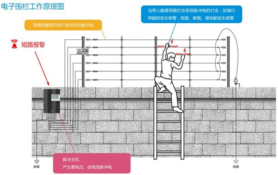 由报警探测器、防区模块、传输网络、报警主机及管理工作站等组成。结合建筑围墙形式对小区周界采用电子围栏进行围闭,共设六个报警防区,当非法攀爬触动电子围栏时,系统通过报警模块 箱把信息传送至监控中心,并联动监控中心弹屏并发警报声进行提醒,监控中心可通过键盘消除报警。电子围栏设备的电源由监控中心ups配电箱取电。下图所示为脉冲电子围栏的工作原理图: