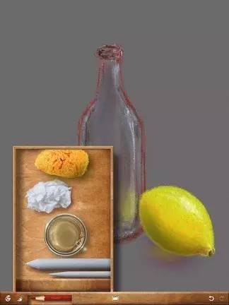 橡皮、海绵、纸团、油画用的亚麻油、纸擦(粗)和纸擦(细)等作画辅助工具