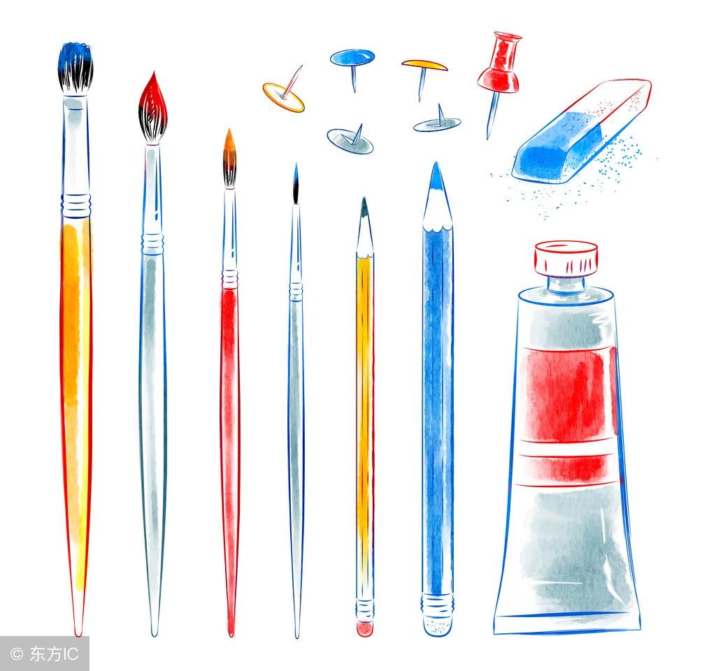 有粉蜡笔、彩色铅笔、粉彩笔、签字笔、马克笔和橡皮擦等各种画笔。