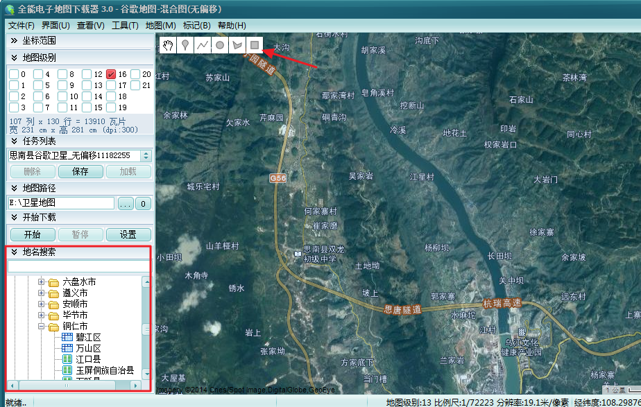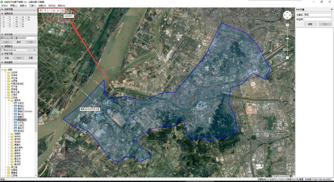 3、然后可以通过在软件右下角的地名搜索框 中按省、市、县,快速选择到需要下载的区域,当然,软件里面只支持选定到县,如果需要到一个乡镇,一个村,那必须我们手动框选,比如我们这里点击地图显示区域的右上角的小菜单中的“绘制矩形 ”图标,在地图上框选一个区域,如下图