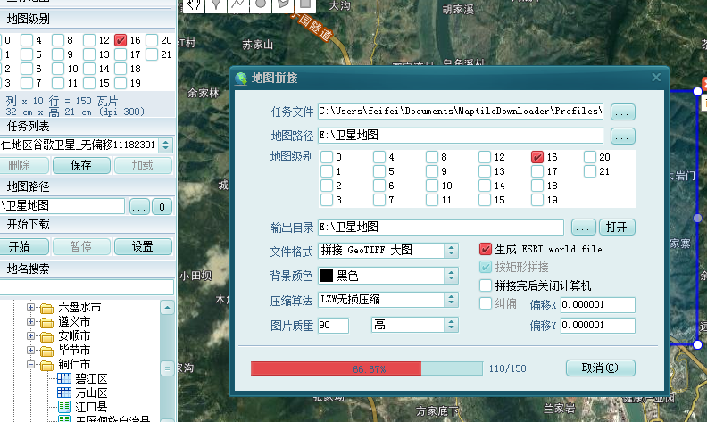 接着点击工具-地图拼接 ,选择任务文件,输出目录,文件格式,图片 质量后,点击开始 (在地图下载完成后,可能自动弹出地图拼接的窗口)