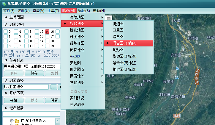 2、在软件最上面一排菜单点击 “地图” ,选择需要的卫星地图来源,比如小编这里选择了“谷歌地图 ”中的“混合图(无偏移) ”,如下图