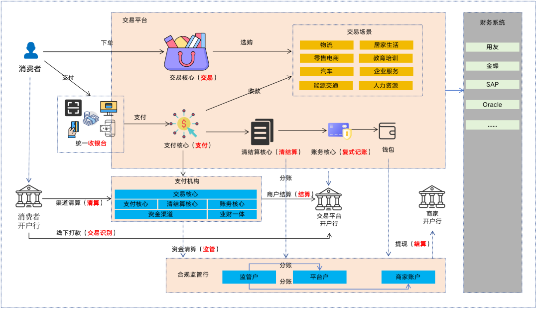 当然这是一个复杂的过程,我在这里做了简化,实际过程中还会涉及到收单机构、机构对商户的结算、商户的提现、机构对外的付款等一系列的事务;最终,资金才会转入到商户的银行账户中。