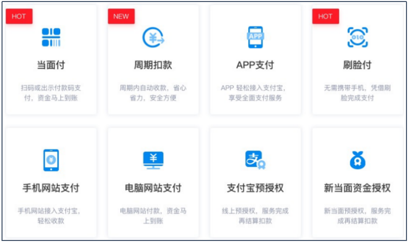 快捷支付:首次绑卡以后,后续不再需要重复绑卡就能支付的银行卡支付产品。网关支付:支付时需要跳转到对应银行的网上银行完成支付的一种支付产品。钱包:以机构账户为基础的资金管理产品,可以进行充值和付款,例如微信钱包。平安见证宝:平安银行推出的资金合规类支付产品解决方案。聚合支付:将多家支付机构的支付产品包装到一起,集成一个涵盖多种支付产品的集成式支付产品,如图1-2所示,扫码方式包括主扫和被扫,下方是所支持的多种支付方式,例如微信、支付宝、银联、易宝银行卡支付等。下图1是微信支付推出的多款支付产品,下图2是支付宝推出的多款支付产品,每款产品都有相应的应用场景,例如微信的小程序支付,应用于微信小程序内的支付。