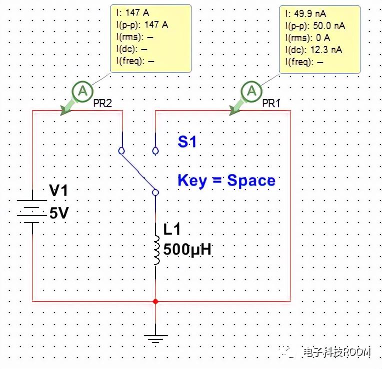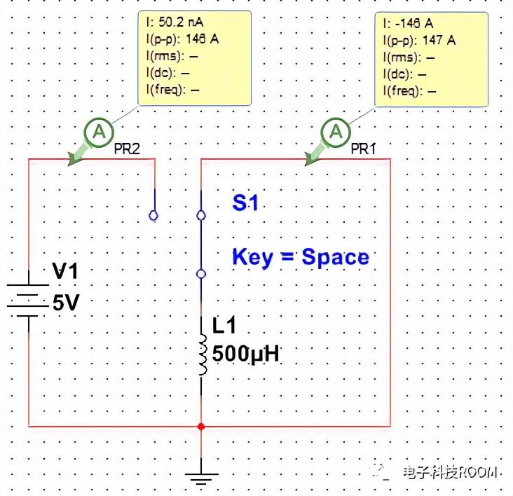 在按键打到左边后,电路迅速增加至147A,此刻如果不暂停电路仿真,电流仍将继续上涨,在暂停时刻将S1打到右边。