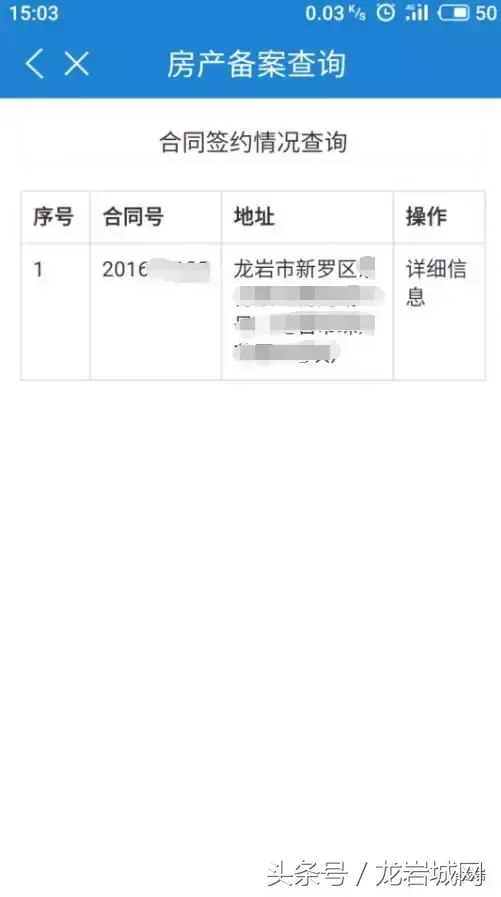 据介绍,想要查询合同备案情况的市民登录e龙岩后,在“服务”模块选择“房产备案查询”功能(如图1)。进入“合同签约情况查询”列表,选择想要查询的合同(如图2),点击“详细信息”按钮即可查询该合同对应的房屋签约情况、备案情况、购房者信息等内容(如图3)。