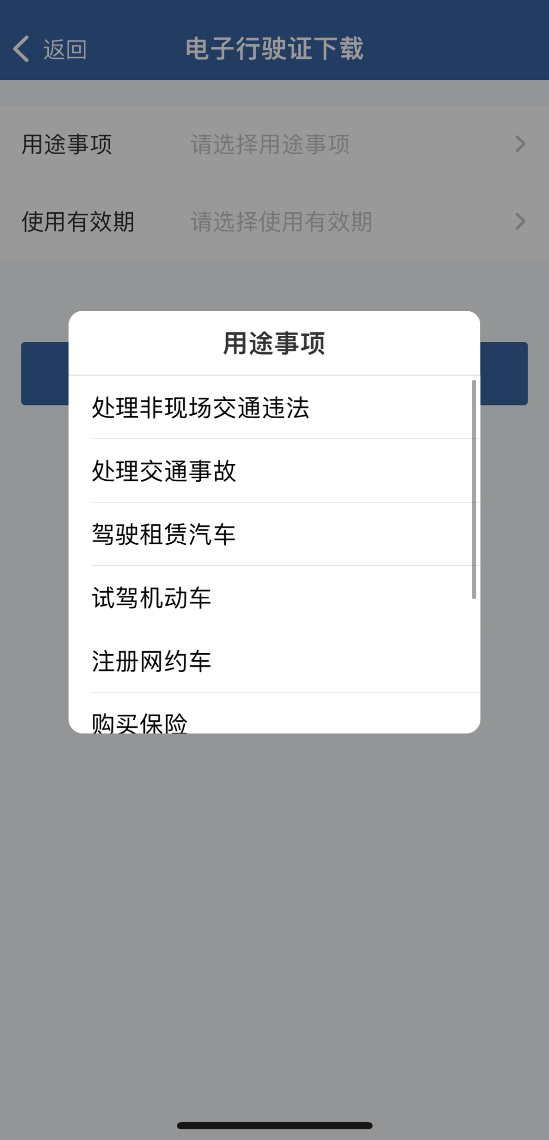 机动车所有人本人办理网上业务,需使用“交管12123”App查询本人名下机动车的电子行驶证:选择用途事项、有效期,下载电子行驶证。