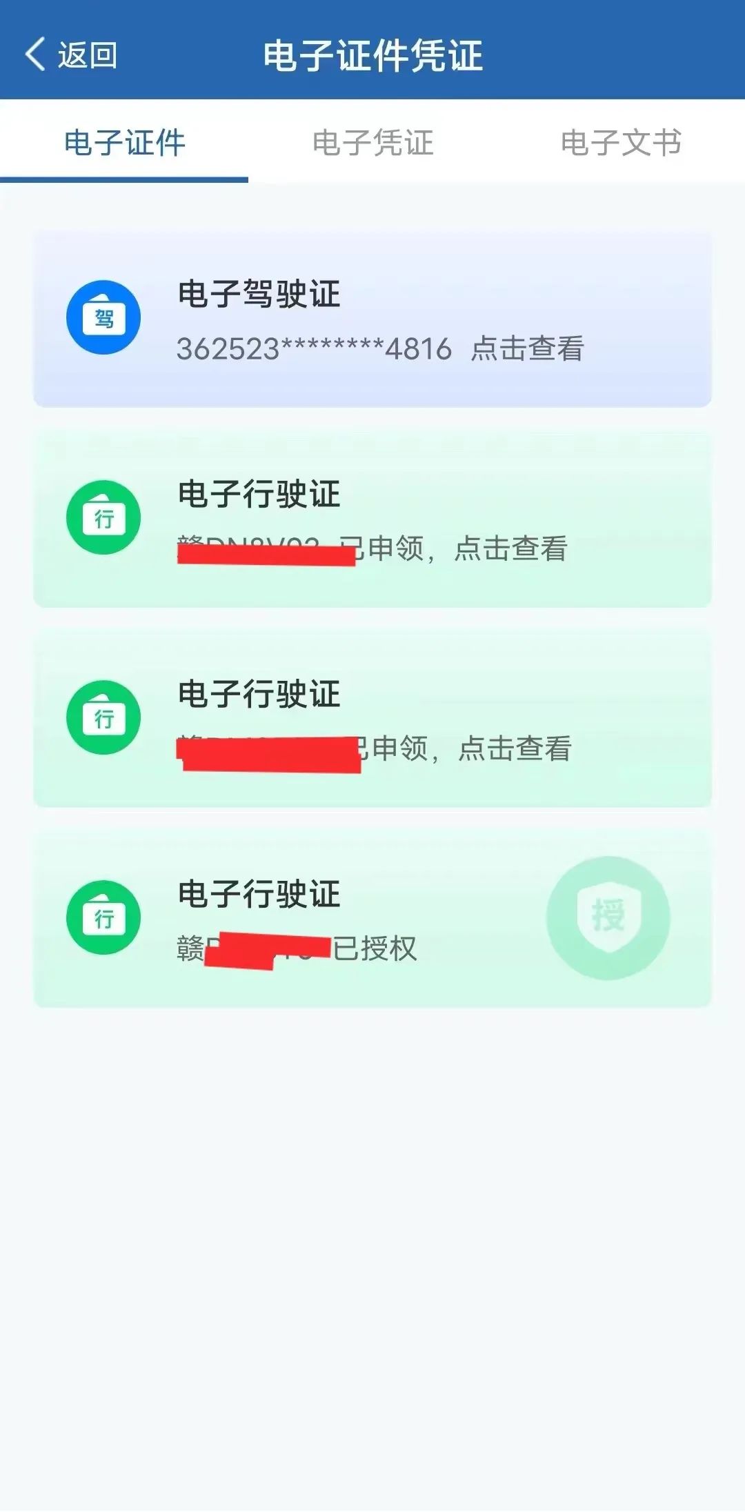 2. 被授权用户可在“电子证件凭证”——“电子证件”功能点击“电子行驶证”出示电子行驶证。