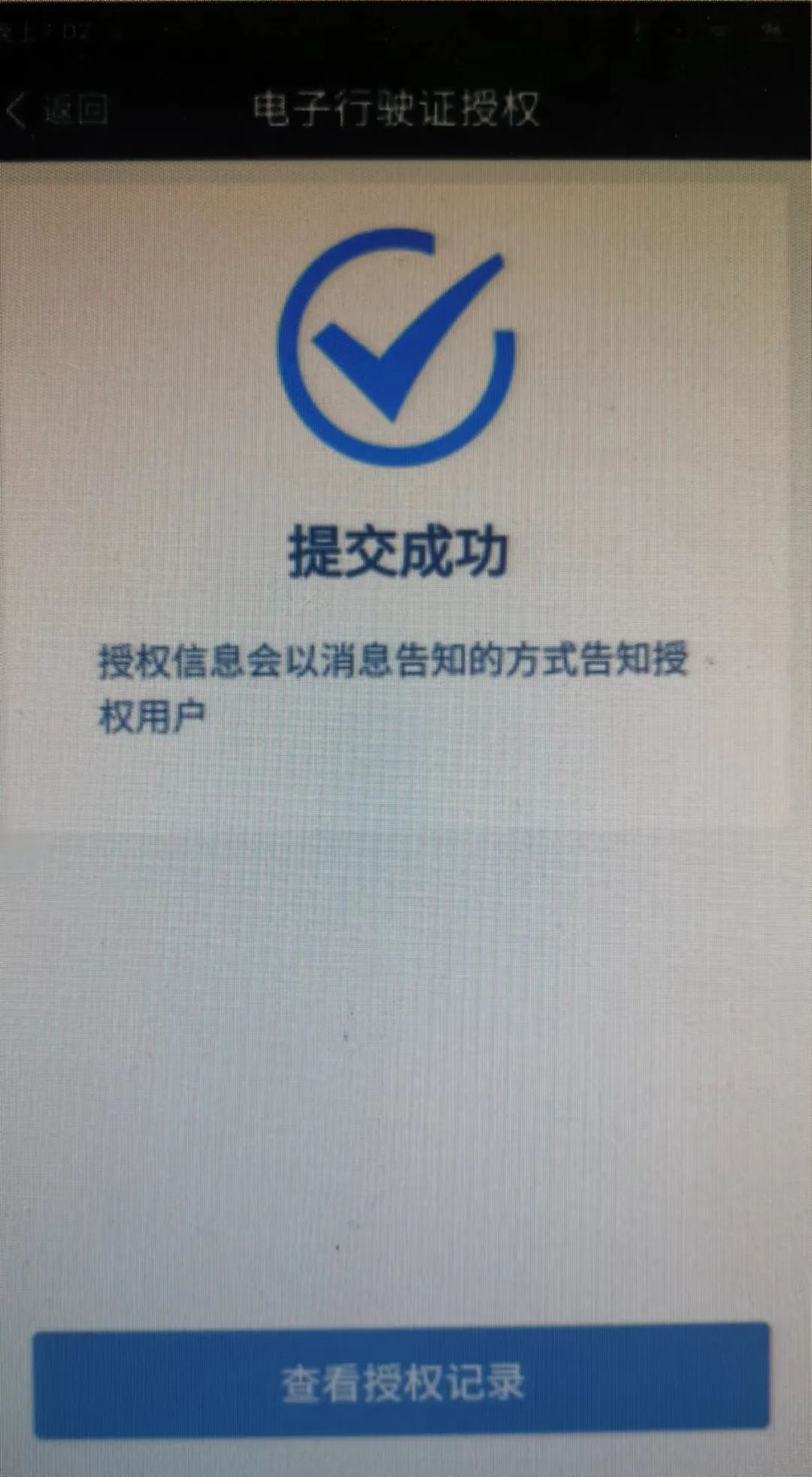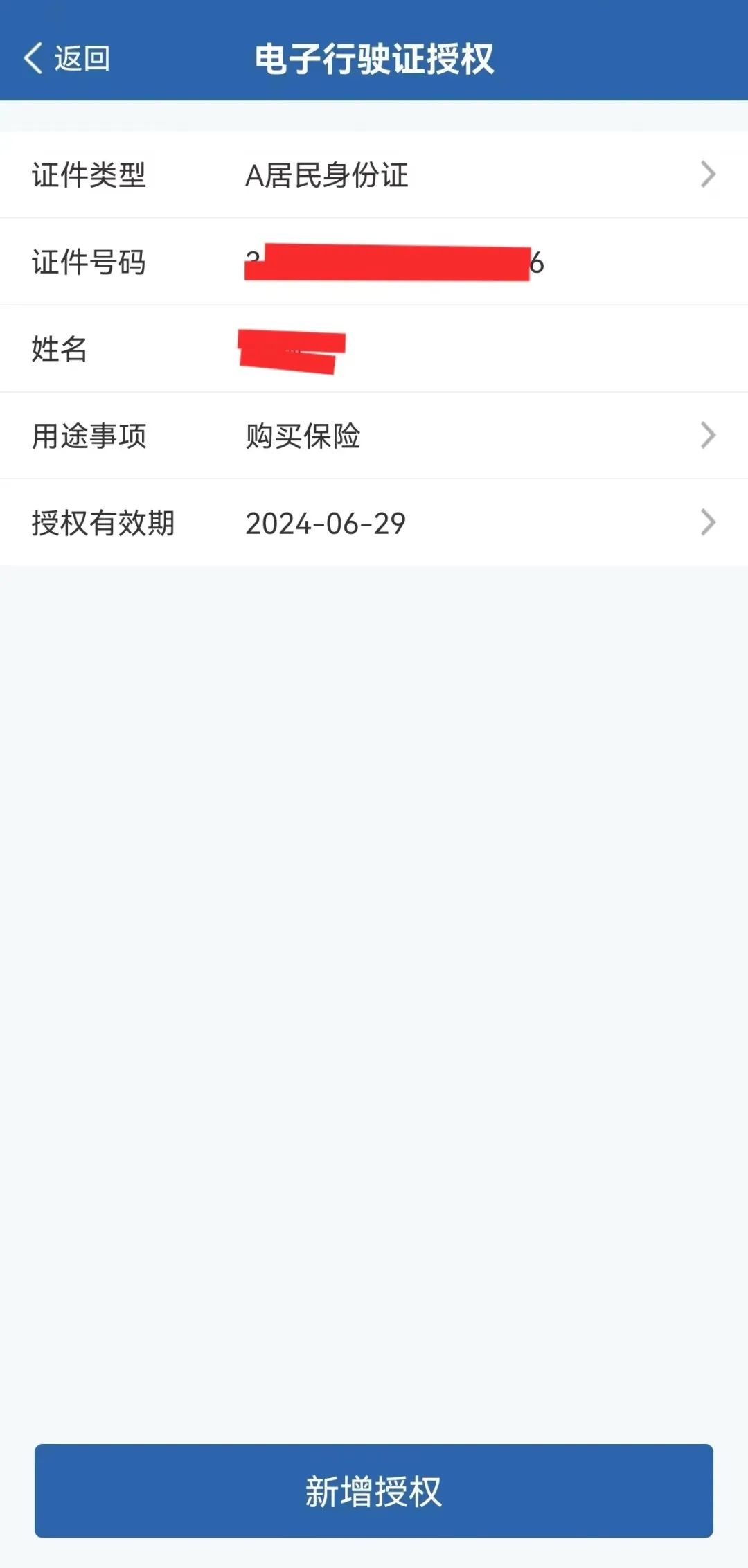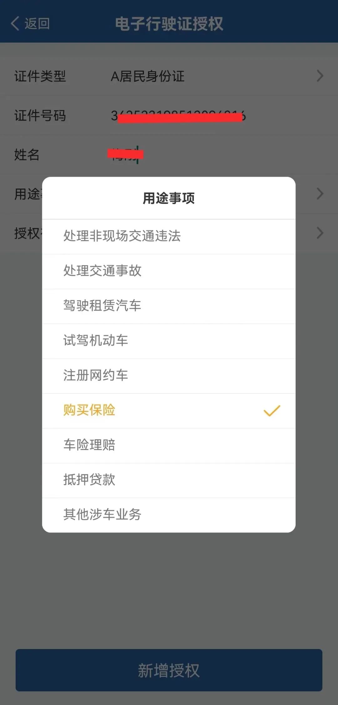1. 用户点击“电子行驶证”页面的“授权”按钮,填写授权使用人身份证件号码、姓名、用途事项、有效期等信息,点击“确定”按钮,可以将自己的电子行驶证授权给他人使用。