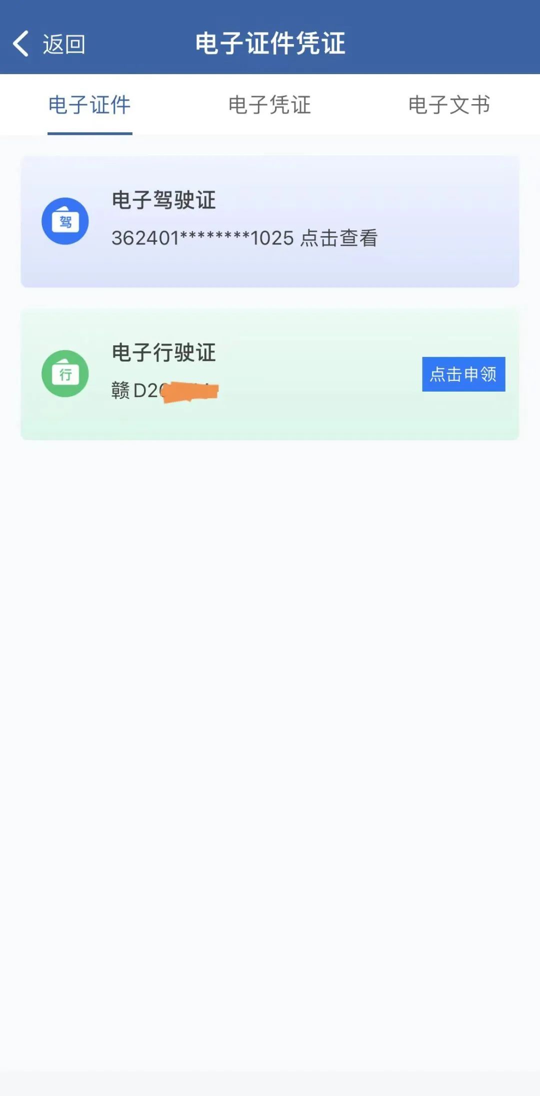 1. [个人用户]登录“交管12123”App后(升级到最新版本),点击首页“电子证件凭证”功能,进入“电子证件”子功能。用户名下有备案机动车的,可点击电子行驶证右侧的“点击申领”按钮进行申领。