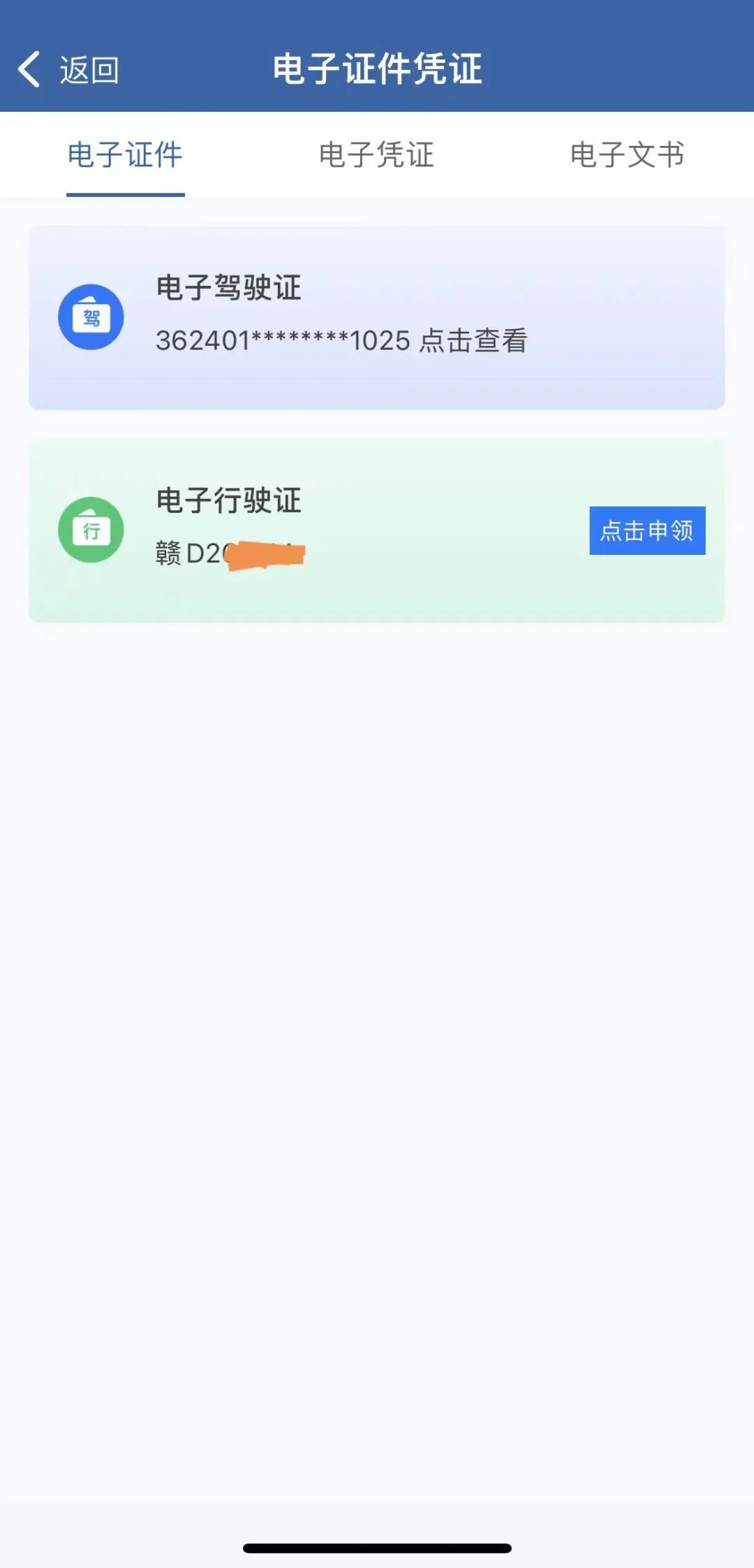 2. 申领成功后,可在“电子证件凭证”——“电子证件”功能中点击“电子行驶证”出示电子行驶证。出示的电子行驶证60秒内有效,超时后App将自动刷新重新出示。