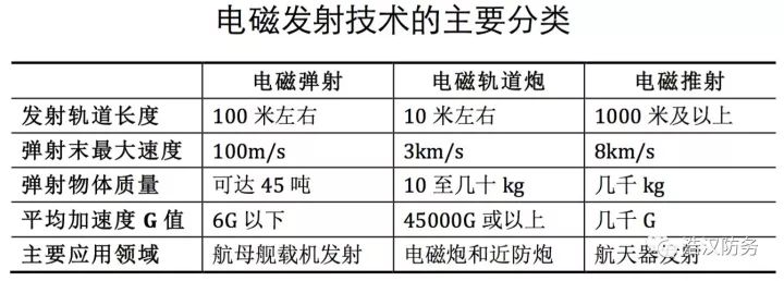 在电磁发射领域,由于其可以实现相当稳定的加速过程,其发射过程可以近似简化为牛顿力学中的零初速度匀加速过程。根据相应的运动公式,其发射过程中所需的加速度其实只受到发射轨道长度S和末速度V两项的影响。更精确一些的说,其加速度和轨道长度成反⽐(轨道越长,所需的加速度越小);和末速度(最终速度)的平⽅值的一半成正比(要求的末速度越大,其所需的加速度越大,⽽且成平方式递增)。由此,我们在附表中给出三种电磁发射方式的参数,及其所需的不同加速度。