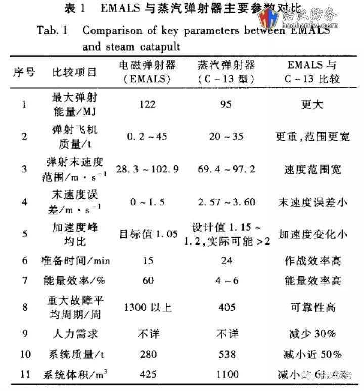 要讨论电磁弹射的优缺点,就必须将其和当前正在使用的蒸汽弹射技术进行对比。在马院士团队的相关论文中,给出了电磁弹射器与当前最成熟的蒸汽弹射器(MD的C-13型)的相关参数对表。将数据两相参照,电磁弹射的压倒性优势一目了然: