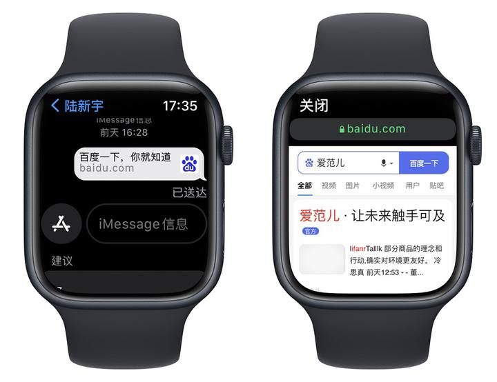 通过 iPhone 给自己发一条消息,比如「baidu.com」。你就能在 Apple Watch 的信息 app 中打开链接了,简单的搜索阅读还是没有问题的。