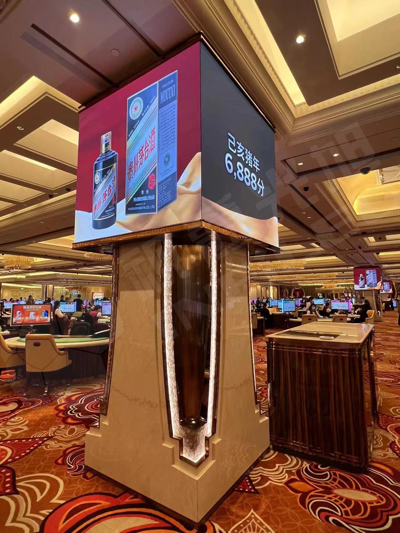 在澳门美高梅金碧辉煌的娱乐场里,场地中央的五根立柱四面都安装了视爵光旭的LED屏幕,上面滚动播放着品牌商品图片还有娱乐指示。