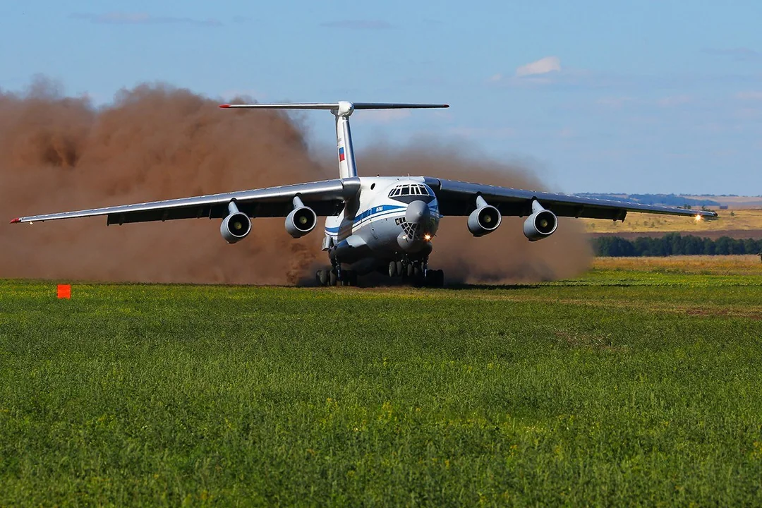 在简易机场降落的伊尔-76。