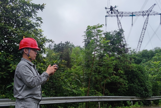 6月27日,在湖南省常德市桃源县,具备电力北斗定位功能的无人机紧急开展巡线检查,巡检无人机精准飞往预定区域,沿预定航线飞行,逐一巡查每座杆塔的情况,并实时回传视频,为工作人员提供重要参考。