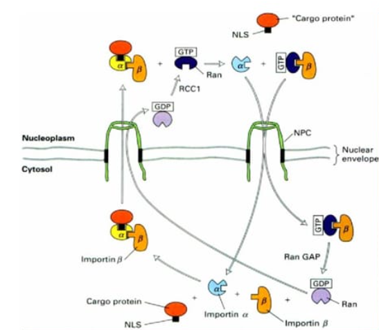 而RanGDP在细胞质中的含量丰富,当核质间存在RanGTP浓度差异时,NTR蛋白可直接或间接结合货物蛋白序列上的NLS序列位点。
